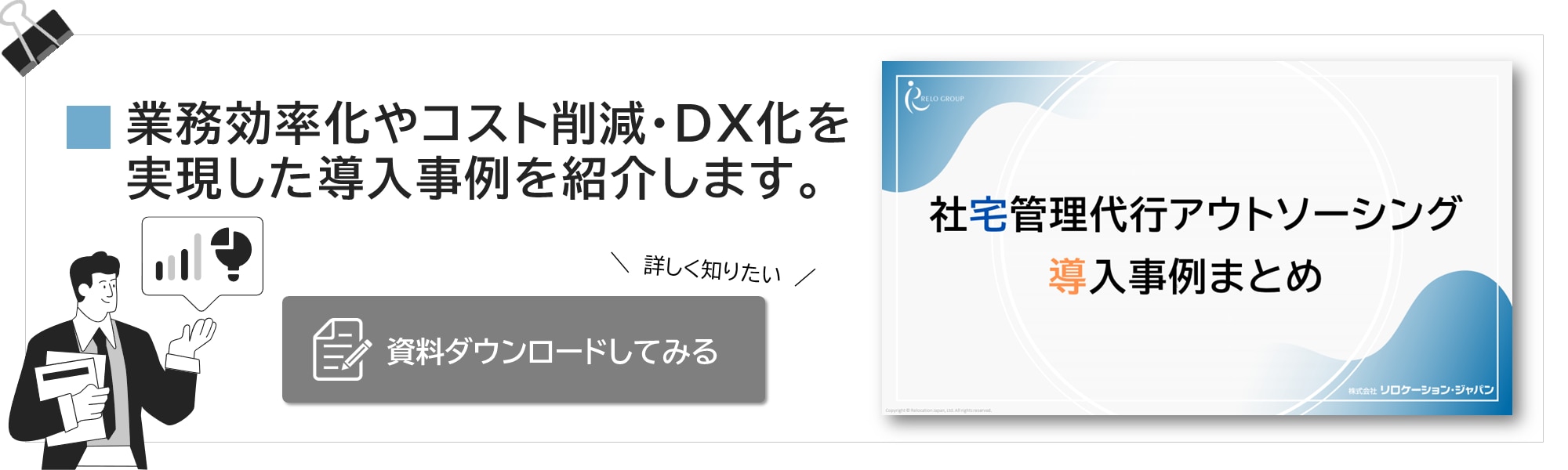なお、社宅管理代行アウトソーシングの導入事例はこちらの資料にまとめています。併せてご確認ください。