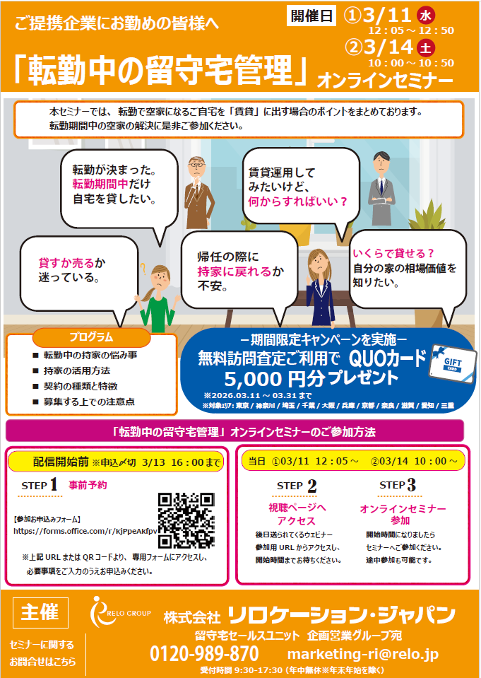 お世話になっております。リロケーション・ジャパンです。 3月に「転勤中の留守宅」オンラインセミナーを2日間開催いたします。